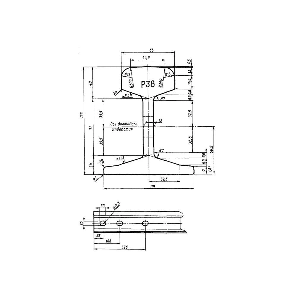 Мы продаем железнодорожный рельс Р38, отгружая со своего склада в продукцию, отвечающую всем действующим нормативам. Согласно ГОСТ 30165-94 и ДСТУ 2539-94, габаритные размеры данного металлопроката составляют 135 мм. в высоту и 114 мм. в ширину (ширина основания). Толщина головки при этом составляет 68 мм., толщина шейки – 13 мм. Рельсы Р38 отгружаются заказчикам в зависимости от приобретаемого тоннажа: при мерной длине в 12,5 метров масса одной рельсы составляет около 481 кг. При необходимости мы готовы поставить заказчику прокат немерной длины – отрезками от 4 до 12 метров.
